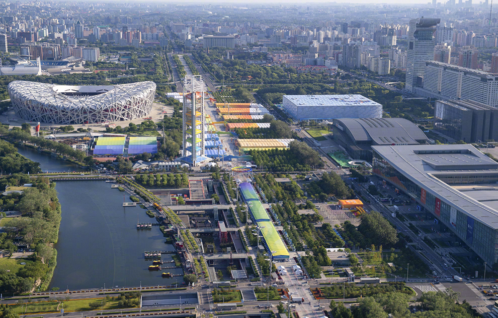 2020年8月,北京的夏天酷暑难耐,建筑工人们仍顶着户外高温、遵循防控要求,有条不紊地工作,在奥林匹克公园中轴景观大道上搭建起一个个橙色、蓝色、黄色展区……