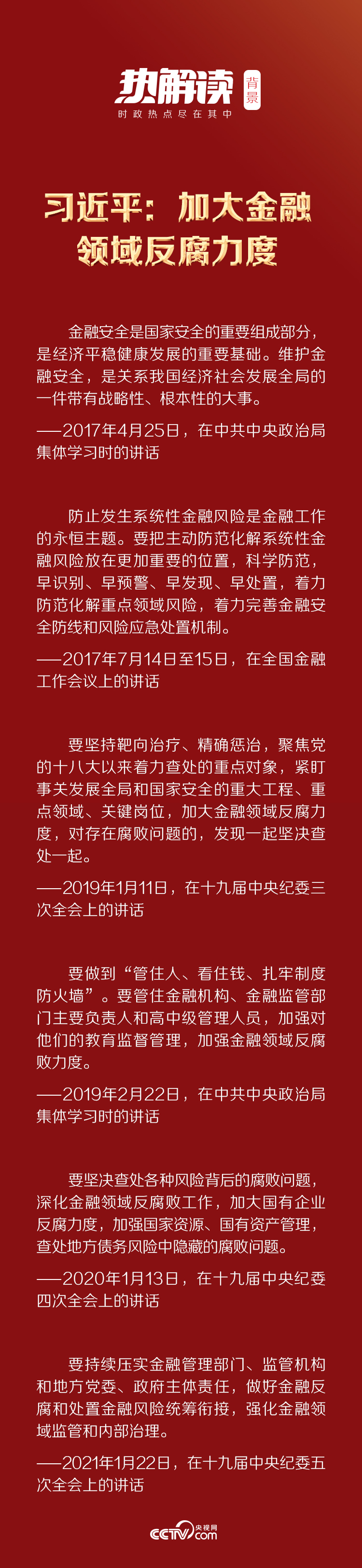 “紧盯事关发展全局和国家安全的重大工程、重点领域、关键岗位”“要坚决查处各种风险背后的腐败问题”“做好金融反腐和处置金融风险统筹衔接”……