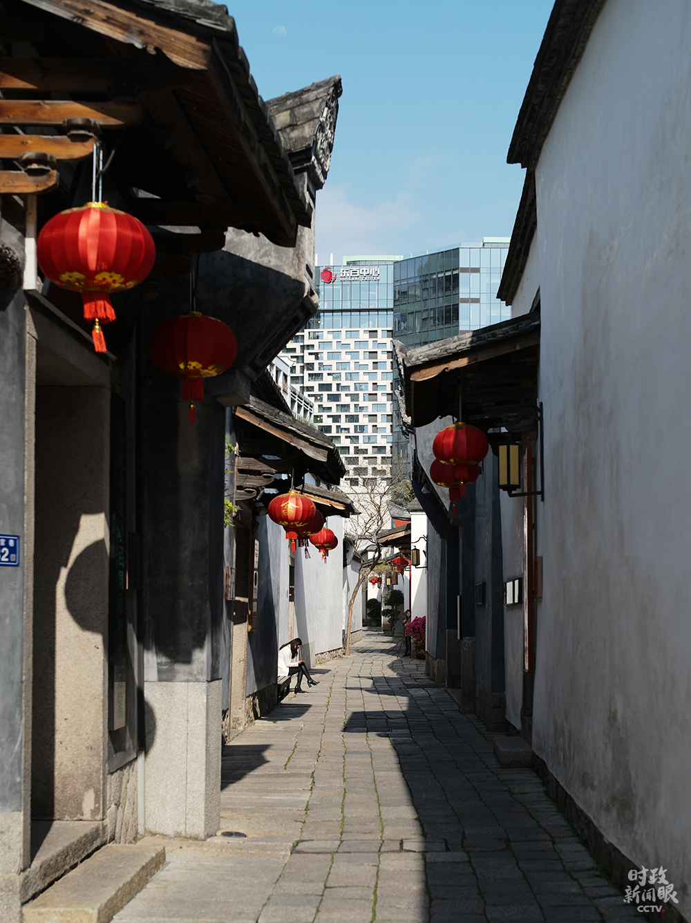 △走进郎官巷,可以看到街区外的高楼,新旧建筑风格交相辉映。(总台央视记者彭汉明拍摄)