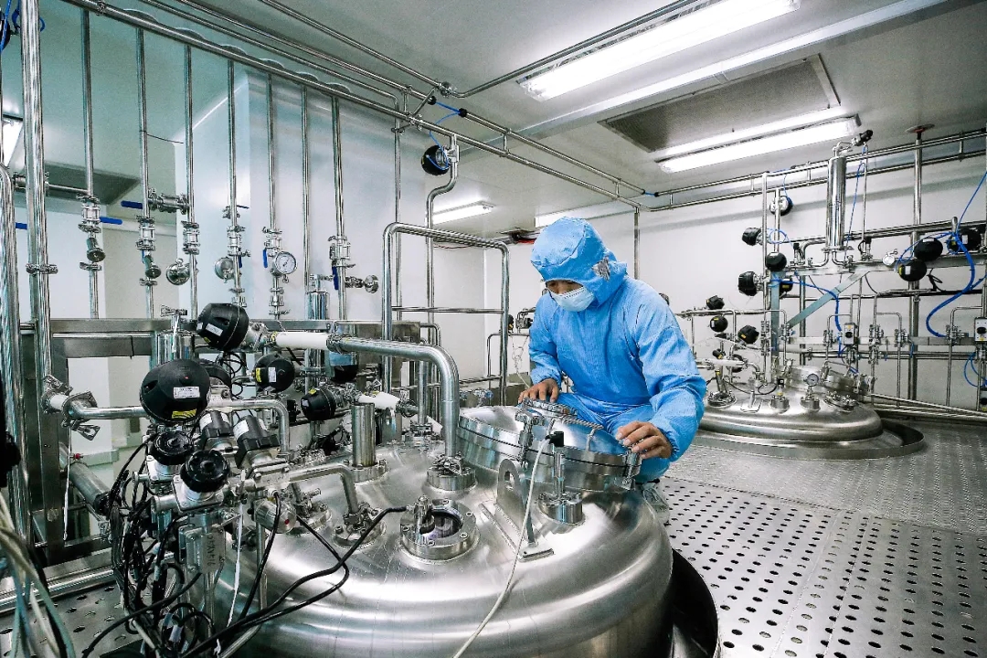 2020年7月15日,科兴中维的工作人员在即将投产的新冠病毒灭活疫苗原液车间高级别生物安全防护区内进行设备的确认。摄影/新华社记者 张玉薇