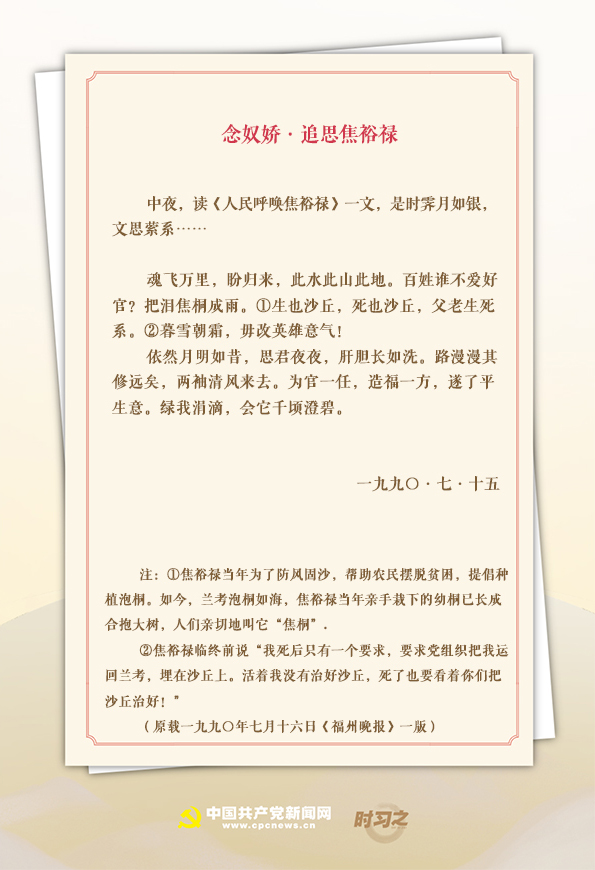 “中夜,读《人民呼唤焦裕禄》一文,是时霁月如银,文思萦系……”1990年7月15日,时任福州市委书记的习近平写下《念奴娇·追思焦裕禄》。