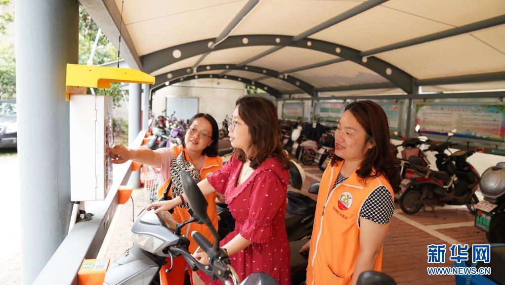 6月24日,“清风志愿者服务队”的成员在江西省南昌市青山湖区和苑小区指导居民使用电瓶车充电装置。新华社记者 胡晨欢摄