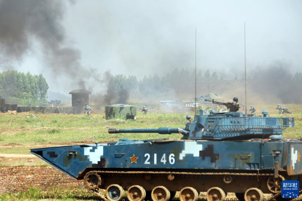 演练中,海军陆战队某旅步兵和装甲车相互协同向目标区域突进(2020年10月11日摄)。新华社发(刘宇翔 摄)