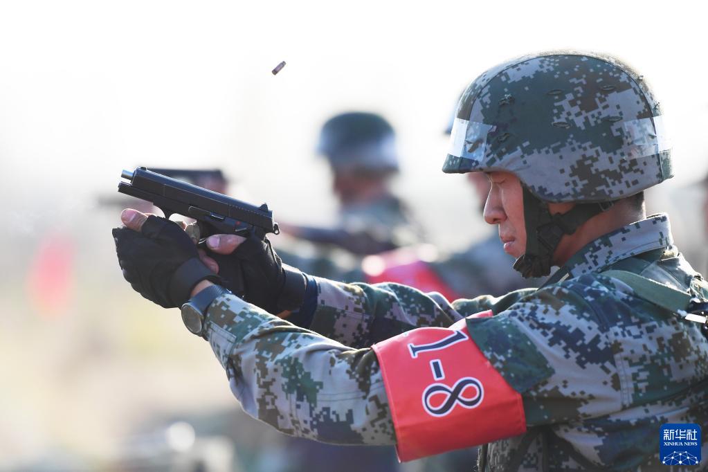 陆军工程大学通信工程学院参赛一队在对抗赛中进行手枪射击课目比赛(2017年11月23日摄)。新华社发(彭希 摄)