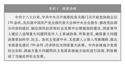中国共产党和各民主党派、无党派人士以会议协商、约谈协商、书面协商等形式,就国家和地方重大政策和重要事务进行协商。中国共产党自觉接受各民主党派、无党派人士的民主监督。中国共产党和各民主党派、无党派人士在国家政权中合作共事,民主党派成员和无党派人士在各级人大代表、人大常委会组成人员及人大专门委员会成员中均占一定数量,一些民主党派成员和无党派人士担任国家机关领导职务。各民主党派、无党派人士紧紧围绕国家中心工作,积极参政议政、建言献策,为国家发展发挥作用。