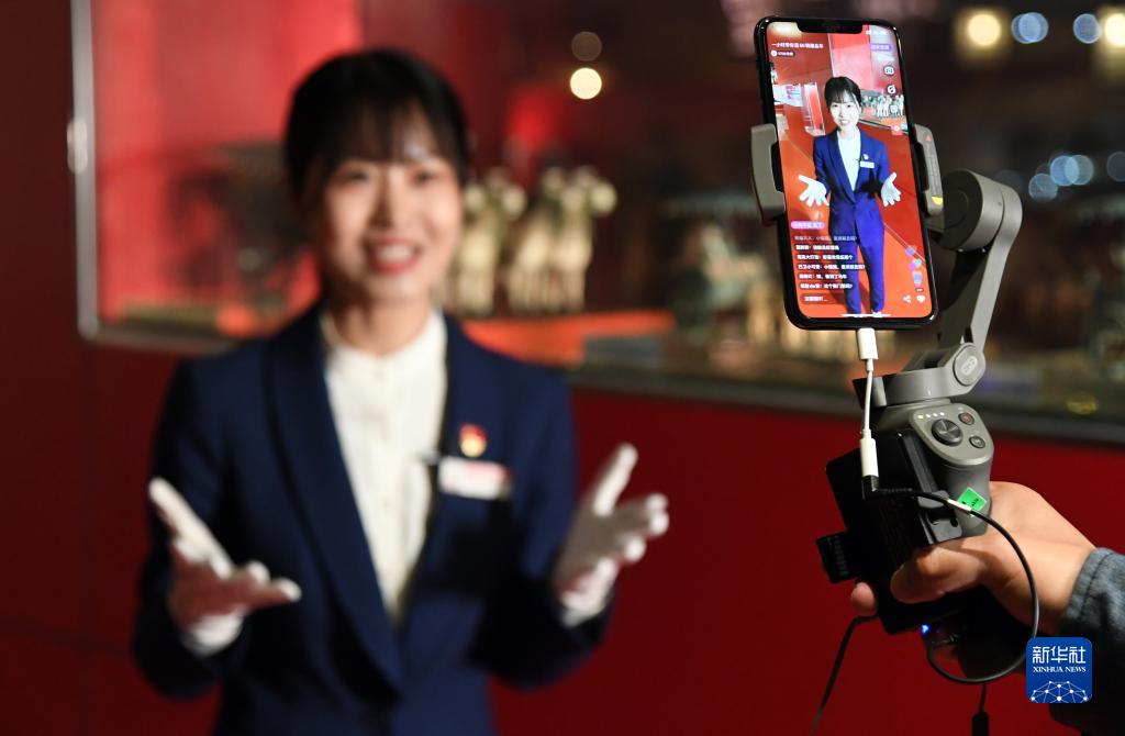 2020年4月30日,在北京汽车博物馆,讲解员曾红娟通过网络直播平台为观众介绍馆内的藏品车。新华社记者 任超 摄