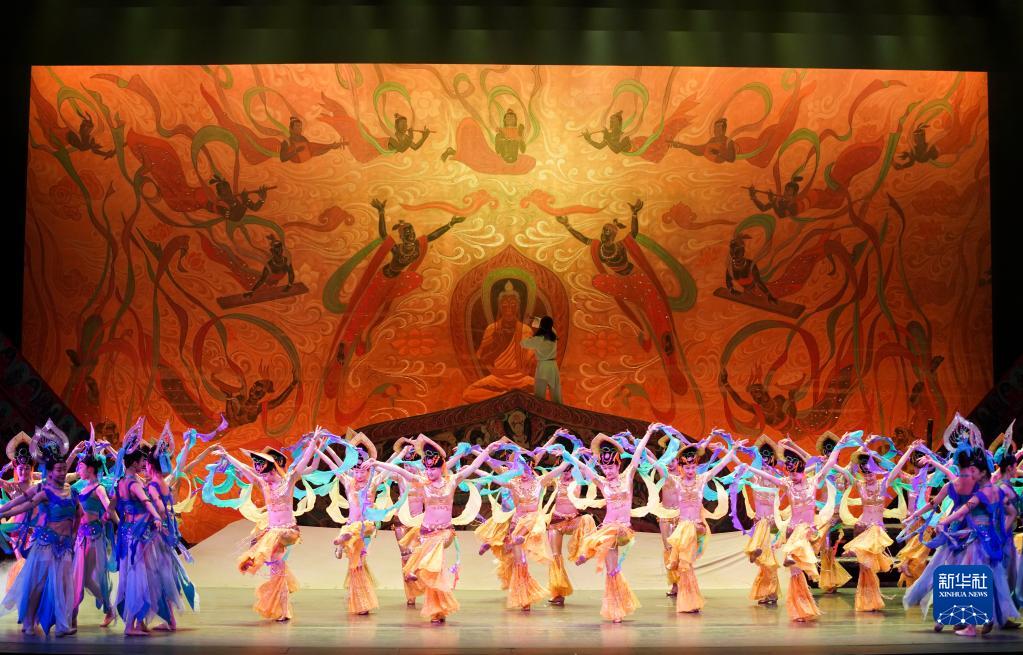 2020年1月9日,在美国纽约林肯剧院,演员在媒体预演上表演《大梦敦煌》片段。新华社记者 王迎 摄