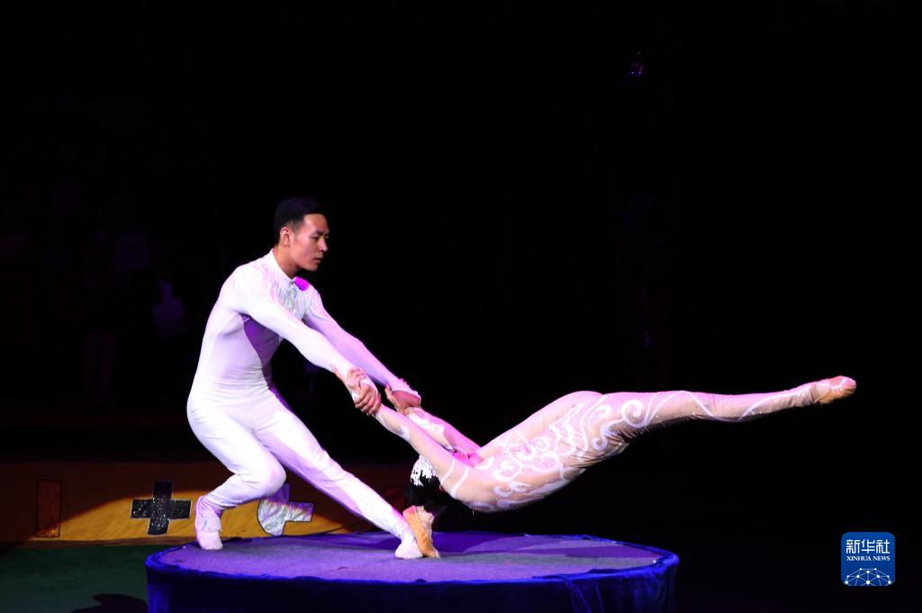 2019年9月4日,在蒙古国首都乌兰巴托,中国河北省沧州市杂技团演员表演杂技。新华社发(苏力雅 摄)