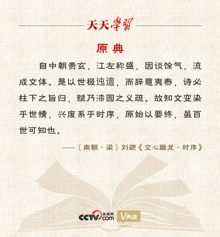 刘勰认为,文学会随着政治的兴衰而发生变化。如唐尧时代,教化普及,所以百姓作《击壤歌》,儿童们唱《康衢谣》。虞舜时代,政治清明,百姓安闲,于是舜唱出了《南风歌》,群臣也和他同唱《卿云歌》。成汤圣哲英明,因而出现了《诗经·商颂·那》中的颂词。周文王恩德隆盛,这时《周南》中的民歌便反映了人们勤劳而无怨言的精神。但周厉王、周幽王时期政治黑暗,因而《诗经·大雅》里的《板》《荡》等诗便充满了愤怒的情绪;平王东迁后,周室衰微,于是出现了亡国哀痛的《王风·黍离》。可见,“时运交移,质文代变”,文学作品的倾向,就是政治生态的形象反映。