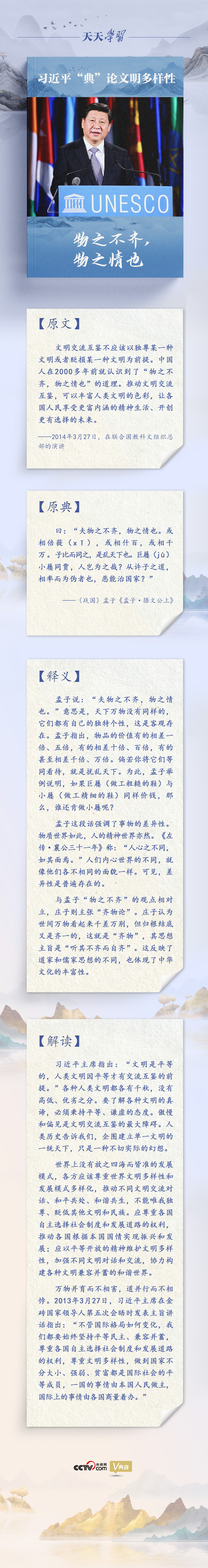 推动文明交流互鉴,需要秉持正确的态度和原则。习近平主席多次在联合国舞台上引用中国古代经典名句,阐述中国对文明多样性的主张,借古以开今,为解决人类问题贡献中国智慧和方案。
