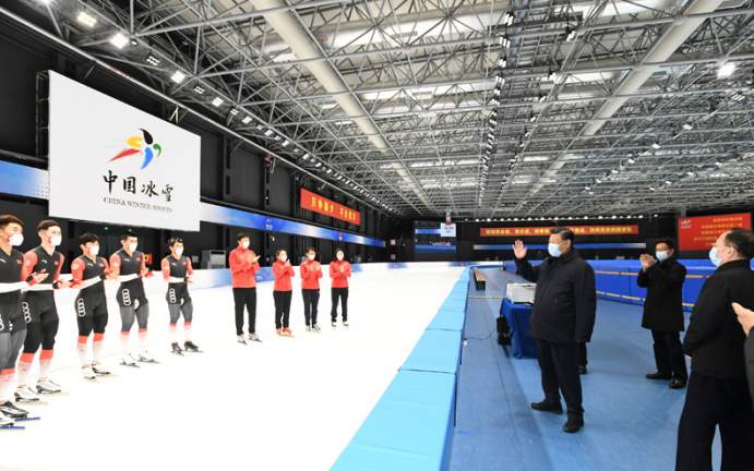 2022年1月4日,习近平总书记在北京考察2022年冬奥会、冬残奥会筹办备赛工作。这是4日下午,习近平在二七厂冰雪项目训练基地速滑馆,向参训运动员、教练员表示慰问。新华社记者 谢环驰 摄