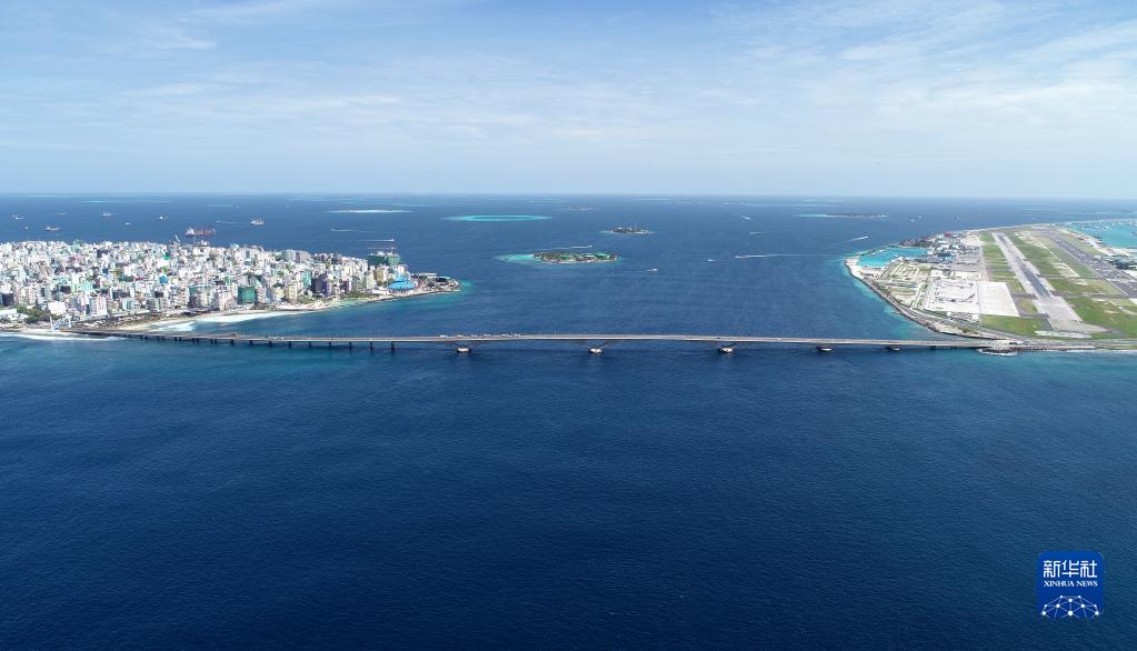这是2019年8月30日在马尔代夫航拍的连接首都马累和机场岛的中马友谊大桥。新华社发(王明亮摄)