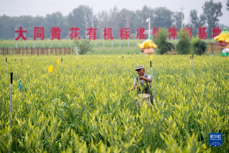 村民在位于云州区唐家堡村的大同黄花有机标准化种植基地内采摘黄花(2022年7月27日摄)。新华社记者 杨晨光 摄