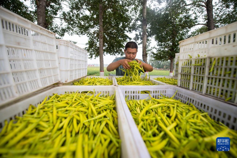村民在云州区唐家堡村查看黄花质量(2022年7月27日摄)。新华社记者 杨晨光 摄