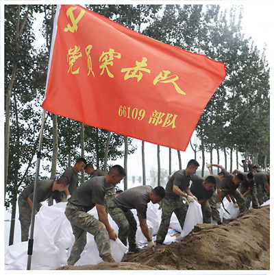 中部战区陆军第81集团军某旅党员突击队加固大清河天津静海段北岸大堤。