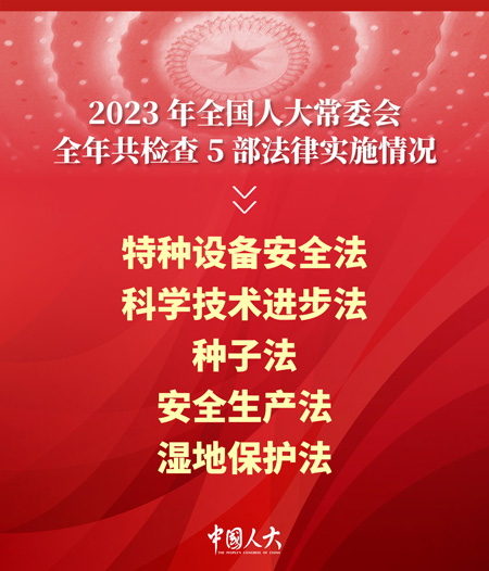 赵乐际委员长指出,要增强监督工作的针对性、实效性。一年来,常委会聚焦党中央重大决策部署,聚焦人民群众所思所盼所愿,加强经济工作监督,加强预算决算审查监督,加强国有资产管理、政府债务管理情况监督,加强民生和社会领域工作监督,加强生态环境保护监督,全年共检查5部法律实施情况,听取审议22个工作报告,开展2次专题询问、7项专题调研,努力把监督工作的针对性、实效性提升到一个新水平。