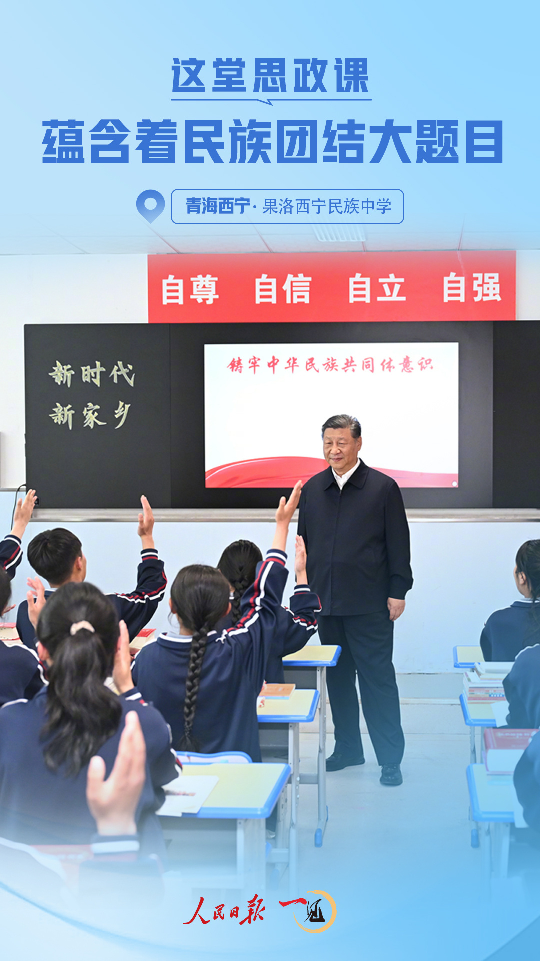 西宁城北,元朔山麓,蓝天白云掩映下的果洛西宁民族中学绿意葱茏。6月18日,正在青海省西宁市考察的习近平总书记来到这里并观摩了一堂思政课。总书记对思政课历来很重视——这是落实立德树人根本任务的关键课程,是培养社会主义建设者和接班人的重要保障。