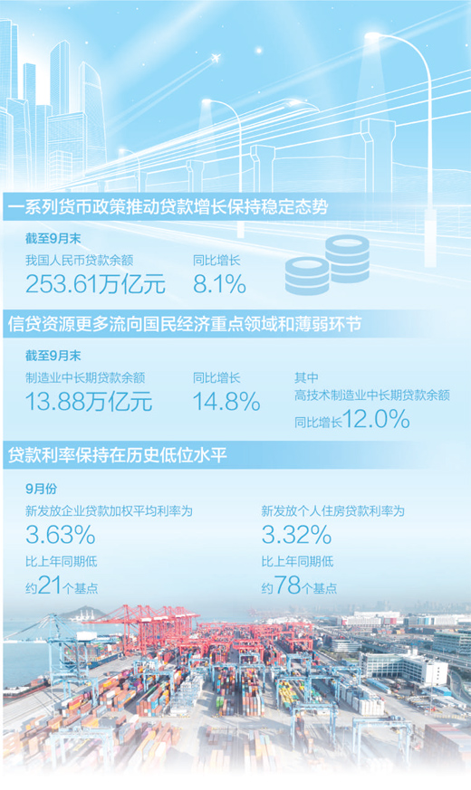 一系列货币政策推动贷款增长保持稳定态势。截至9月末,我国本外币贷款余额257.71万亿元,同比增长7.6%,人民币贷款余额253.61万亿元,同比增长8.1%。量增的同时,贷款利率保持在历史低位水平。9月份新发放企业贷款加权平均利率为3.63%,比上年同期低约21个基点;新发放个人住房贷款利率为3.32%,比上月低约2个基点,比上年同期低约78个基点,均处于历史低位。