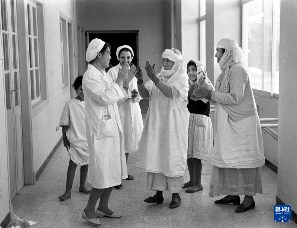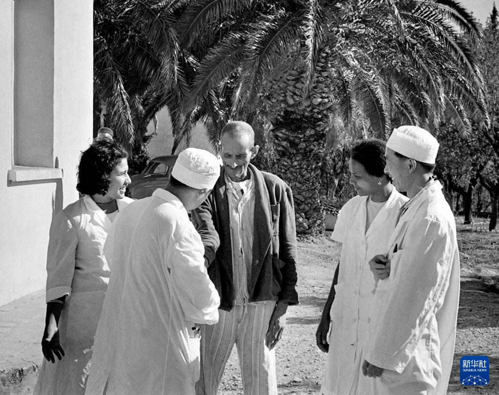 这是中国援阿医疗队医生张友明(右)在阿尔及利亚的资料照片。现已90岁的张友明曾是首支中国援阿的一员,在阿尔及利亚工作了两年半,成功实施上千台手术,让很多当地孩子平安降生。