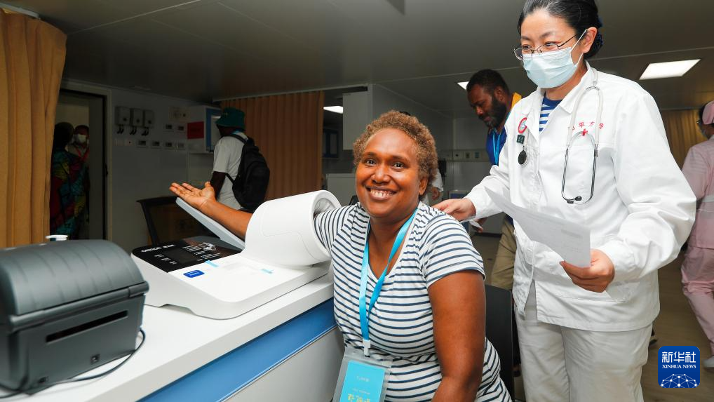 2023年8月21日,前来就诊的所罗门群岛民众在中国海军“和平方舟”号医院船进行血压检测。
