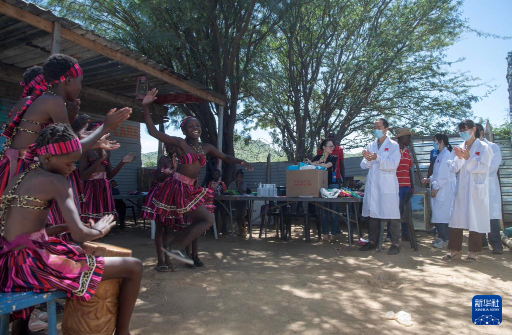 2023年2月16日,中国第14批援纳医疗队来到距纳米比亚首都温得和克市中心约20公里的弗兰斯艺术培训中心,对在此学习的学生进行健康检查。这是艺术培训中心的同学们用传统舞蹈感谢中国医生。