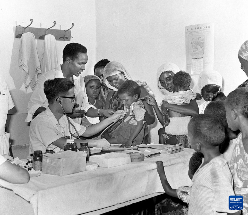 1968年4月,中国医疗队在索马里阿弗戈依镇巡回医疗时为当地儿童治病。