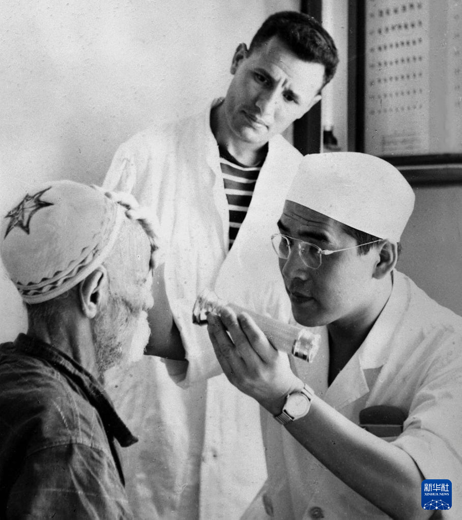 1964年10月,中国医疗队眼科医生刘钢正在阿尔及利亚赛伊达为一白内障患者进行手术前的检查。