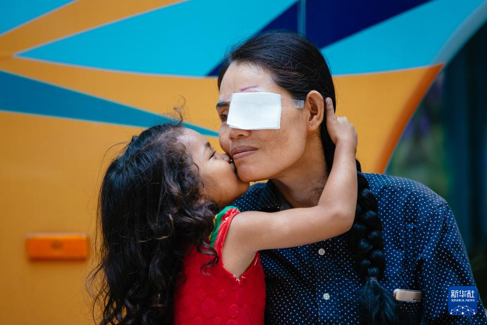 这是2019年3月15日,在柬埔寨磅湛省医院,即将接受白内障手术的患者孙美乐接受女儿的亲吻祝福。孙美乐是柬埔寨一名贫困的单身母亲,左眼患上白内障几近失明。在接受了中国医疗队的白内障义诊手术后,她的视力逐步恢复,生活有了新的光明和希望。