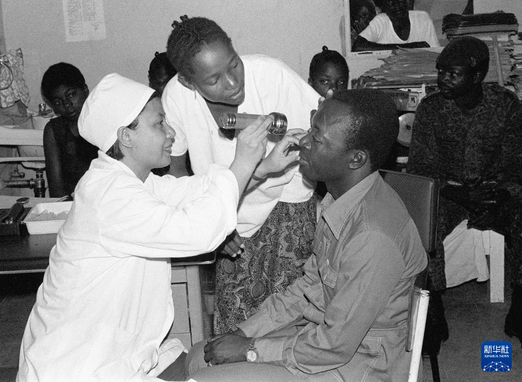1979年3月,在扎伊尔(即现在的刚果(金))首都金沙萨的金丹堡医院,中国眼科医生在为当地病人检查。