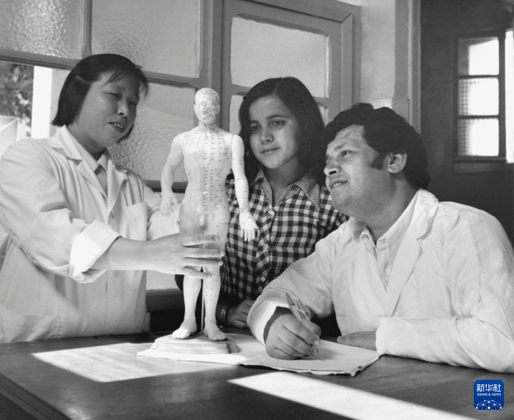1976年11月,中国医疗队的医生在突尼斯马迪亚医院给突尼斯医务人员讲解针灸穴位。
