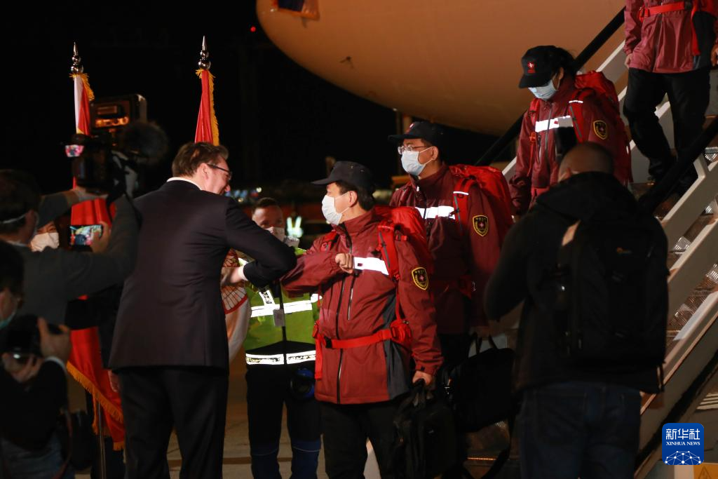 这是2020年3月21日,在塞尔维亚首都贝尔格莱德,前来迎接的塞尔维亚总统武契奇(左)与中国援助塞尔维亚抗疫医疗专家组成员“碰肘”致意。