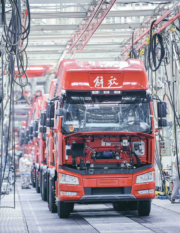 2020年8月10日,工人在位于吉林省长春市的中国第一汽车集团有限公司解放总装车间装配车辆。一汽2020年7月销售整车32.2万辆,同比增长23.2%,延续了上半年的增长态势。 新华社记者 张楠/摄