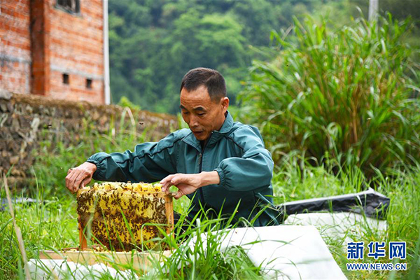 江西省赣州市赣县区韩坊镇农民在查看蜂箱(2018年4月25日摄)。 新华社发(李明水 摄)