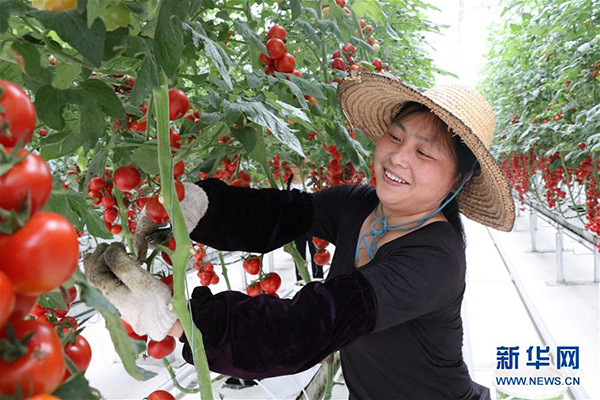 江西省赣州市赣县区江口镇农民在蔬菜基地里采摘西红柿(2018年5月5日摄)。新华社发(卢小雪 摄)