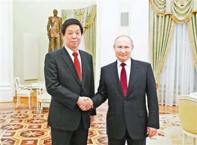 会见普京时,栗战书首先转达了习近平主席的亲切问候。栗战书说,在习近平主席和总统先生的战略引领和推动下,中俄关系达到前所未有的高度,迈入更高水平、更大发展的新时代。在当前国际形势下,中俄应更加坚定相互支持,共筑两国战略依托和安全屏障,推动构建新型国际关系和人类命运共同体。要在两国元首的战略引领下,把政治互信和战略协作推向新高度,把经贸合作推向新水平,推动中俄新时代全面战略协作伙伴关系不断向前发展。普京请栗战书转达对习近平主席的良好祝愿。他说,俄中关系是当今世界大国关系的典范。俄中新时代全面战略协作伙伴关系建立在遵守国际法基础上,符合两国及两国人民利益。当前两国各领域合作都向着既定目标稳步推进。要在现有基础上,深化全面合作,把两国关系发展得更好。