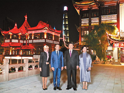 十一月五日晚,国家主席习近平和夫人彭丽媛在上海豫园会见法国总统马克龙和夫人布丽吉特。