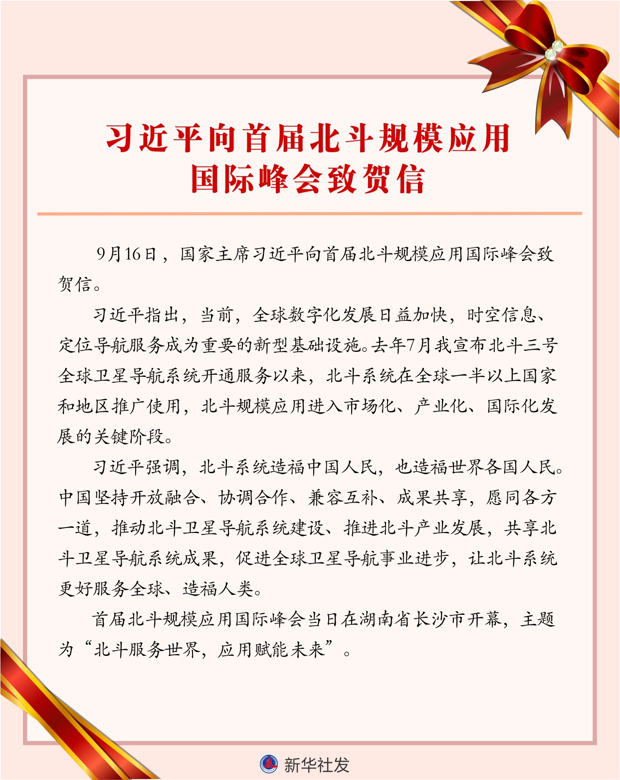 新华社北京9月16日电 9月16日,国家主席习近平向首届北斗规模应用国际峰会致贺信。