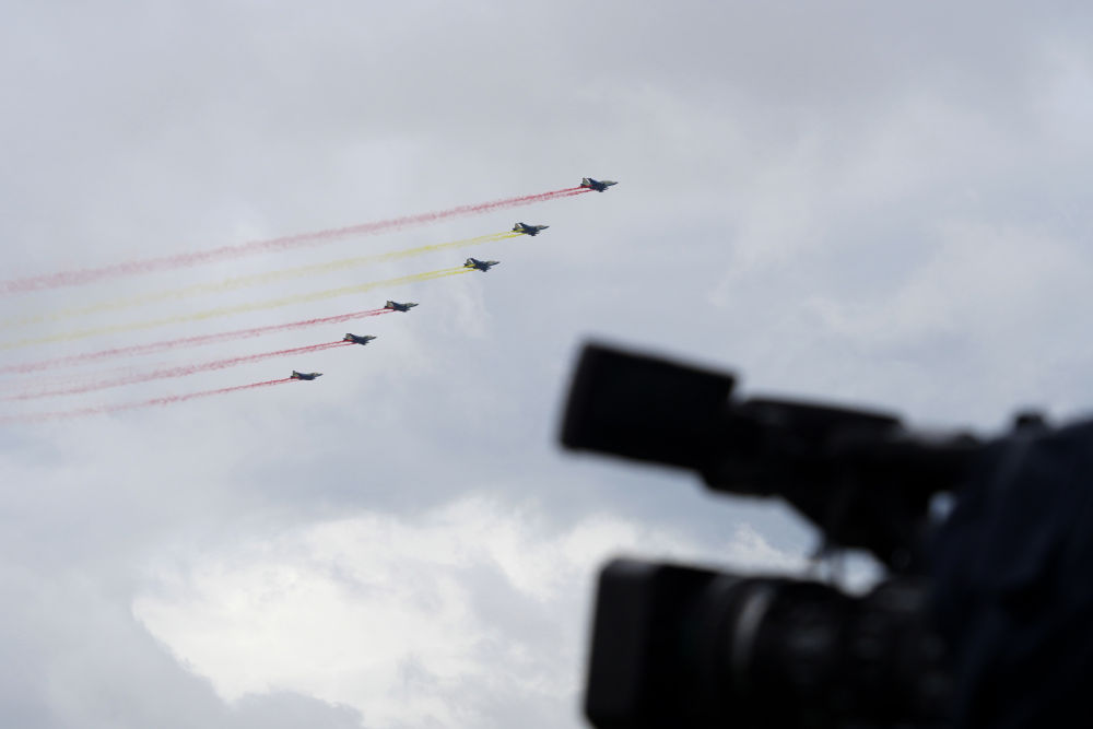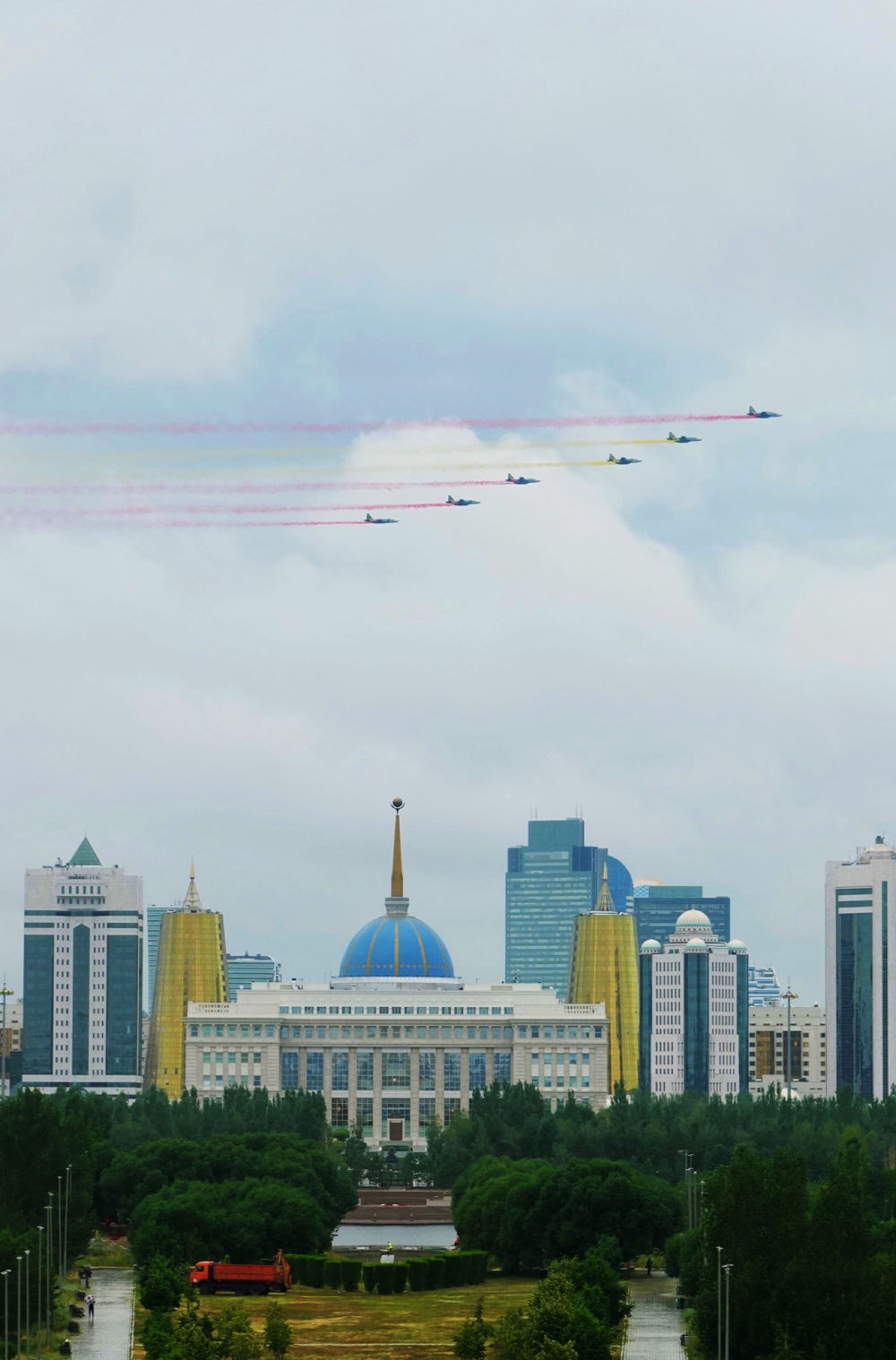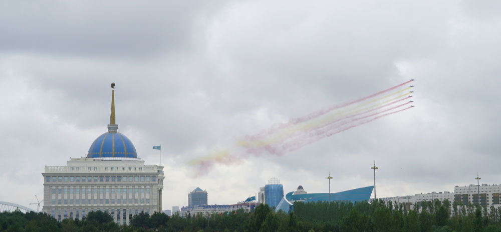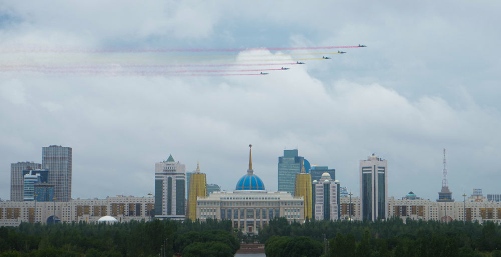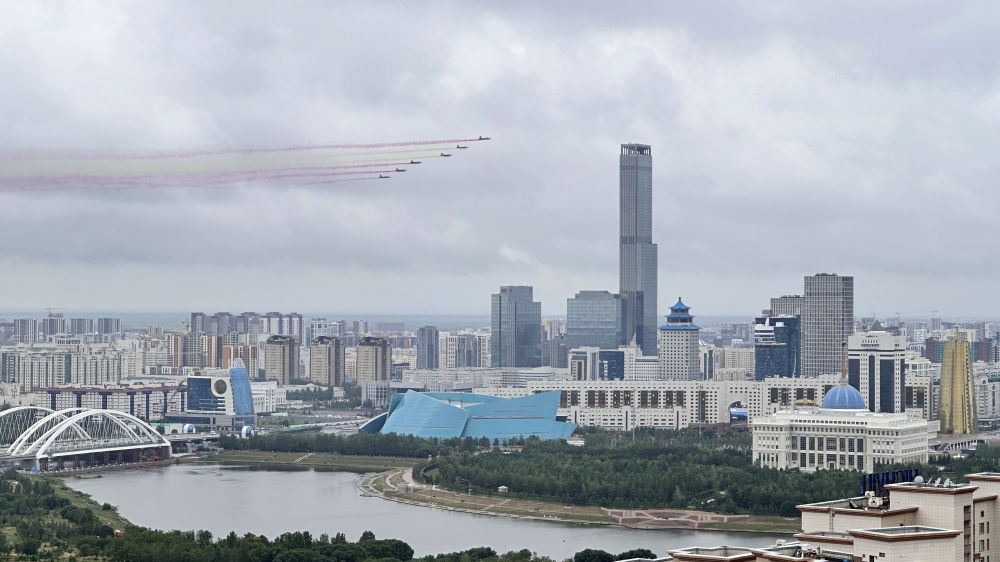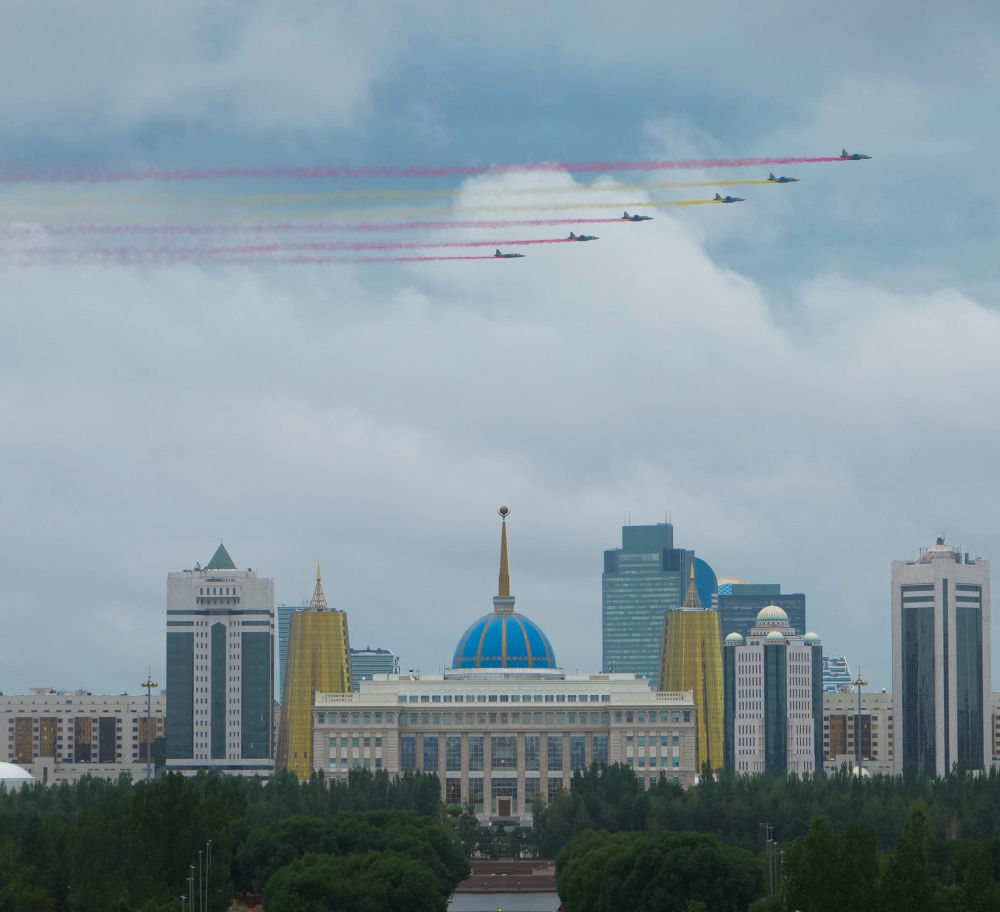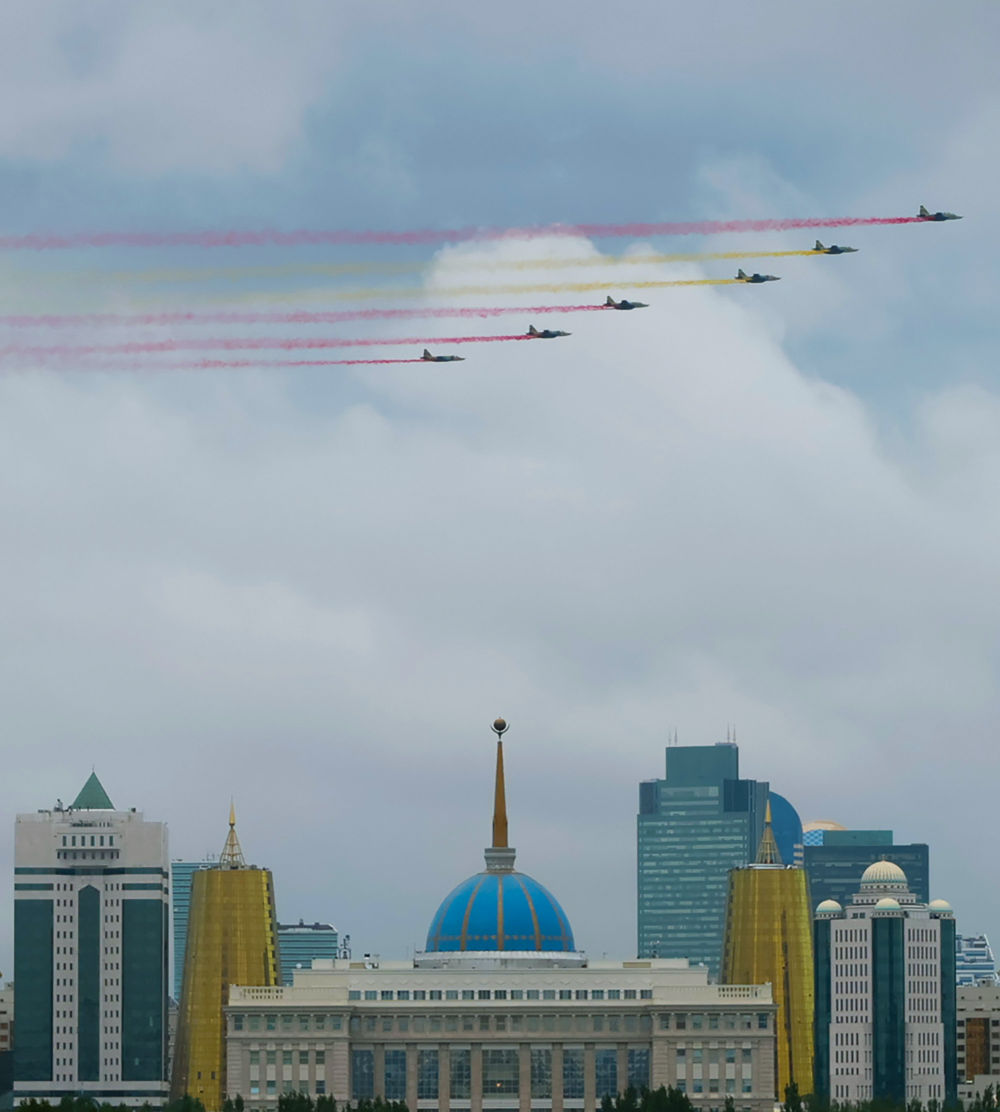 习近平主席抵达时,哈方多架战机在总统府上空拉出中国国旗色彩烟欢迎中国贵宾。