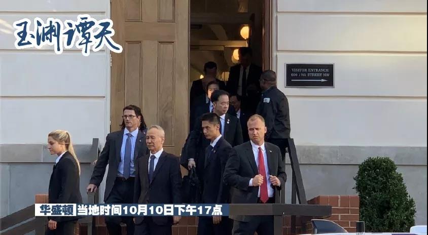 刘鹤副总理一行走出美国贸易代表办公室。新一轮中美经贸高级别磋商第一天的磋商议题结束。