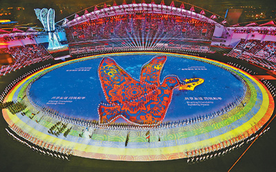 “共享友谊,同筑和平”“共商、共建、共享、共赢”“创新、协调、绿色、开放、共享”等中英文字样闪动在场地中。“构建人类命运共同体”的梦想种子,是中国与世界的交响协奏。这一刻,属于中国,也属于世界。