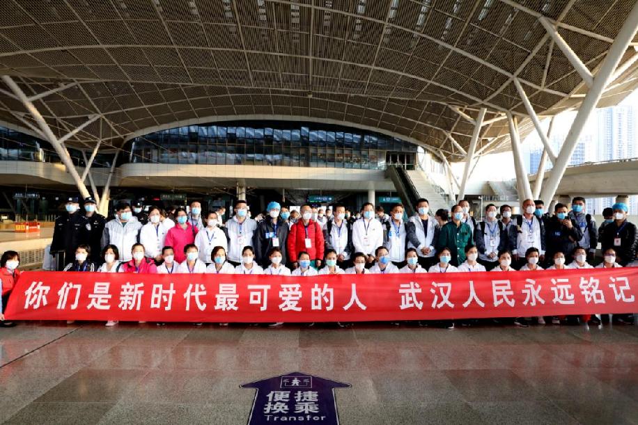 随着疫情防控形势逐步转好,完成救助任务的各地驰援医疗队将分批有序撤离。当日,来自贵州、湖南、河南三省的484名援鄂医护人员分8批次,分别乘坐5趟高铁踏上回家的路程,在武汉火车站,铁路民警、车站工作人员和志愿者们在进站口、候车室、站台上欢送这群最美丽的“白衣天使”。