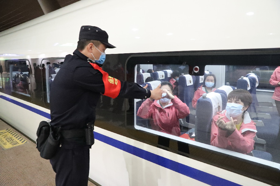 站台上,武汉铁路民警和工作人员向即将归家的英雄们致敬,护航列车安全驶离。