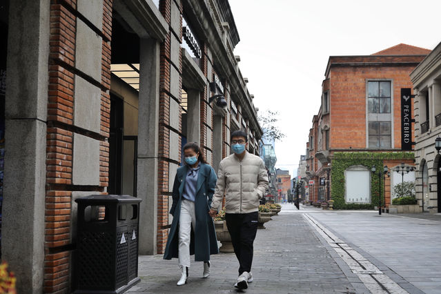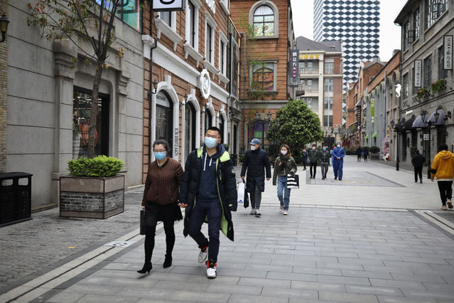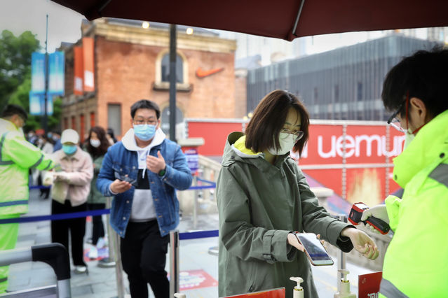 3月30日,武汉市楚河汉街,工作人员在步行街入口处为顾客测量体温。当日,武汉市标志性步行街楚河汉街恢复营业。目前,武汉多家商场、购物中心复工复产获批,除市疫情防控指挥部发布的影剧院、棋牌室、游艺厅、书店、网吧、舞厅、酒吧、KTV、公共浴室、足浴店、美容店、健身房、培训机构、堂食类餐饮等限制清单内的业态以外,其他经营部分可恢复营业。中青报·中青网记者 赵迪/摄