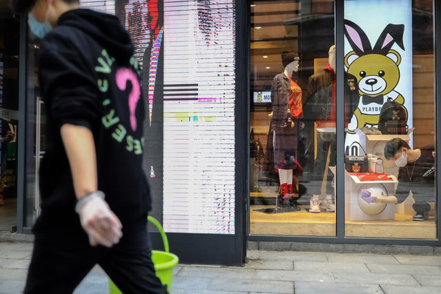 3月30日,武汉市楚河汉街一家店铺内,一名店员在清洁窗户。中青报·中青网记者 赵迪/摄