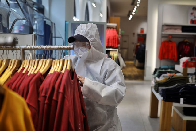 3月30日,武汉市楚河汉街一家店铺内,一名店员在整理衣物。中青报·中青网记者 赵迪/摄