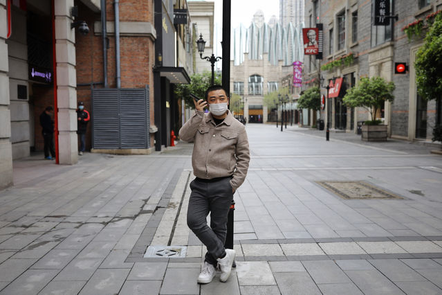 3月30日,武汉市楚河汉街,27岁的店铺老板李猛在打电话给员工订餐。中青报·中青网记者 赵迪/摄