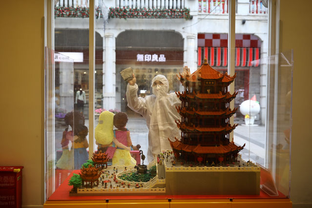 3月30日,武汉市楚河汉街一家拼装积木店,工作人员在清洁窗户,一边是武汉黄鹤楼的拼装积木。中青报·中青网记者 赵迪/摄