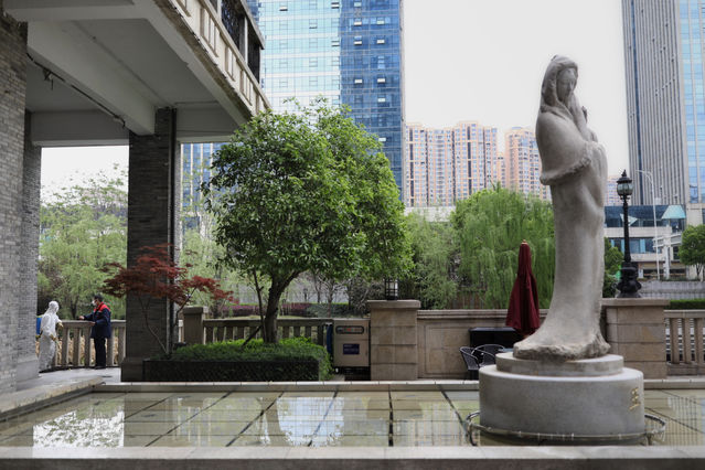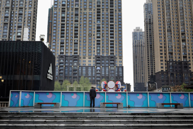 3月30日,武汉市楚河汉街,一名工作人员向外眺望。中青报·中青网记者 赵迪/摄
