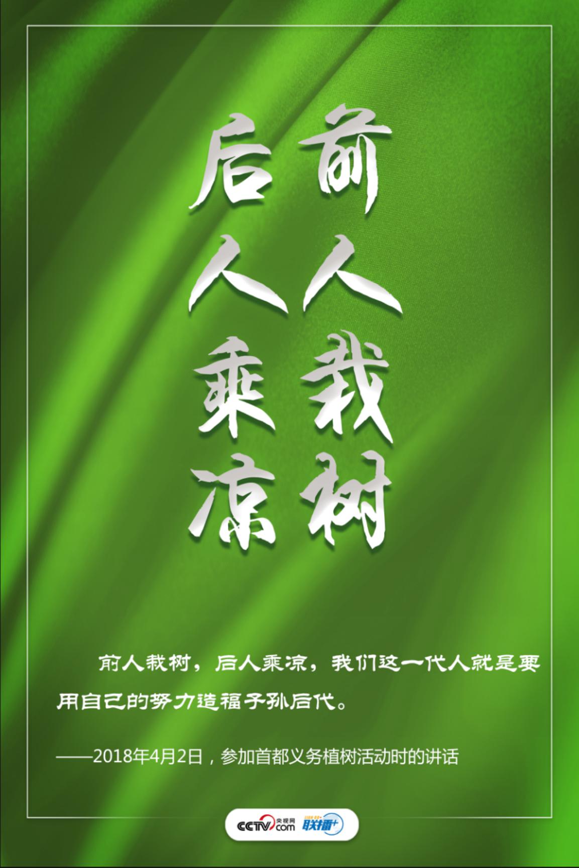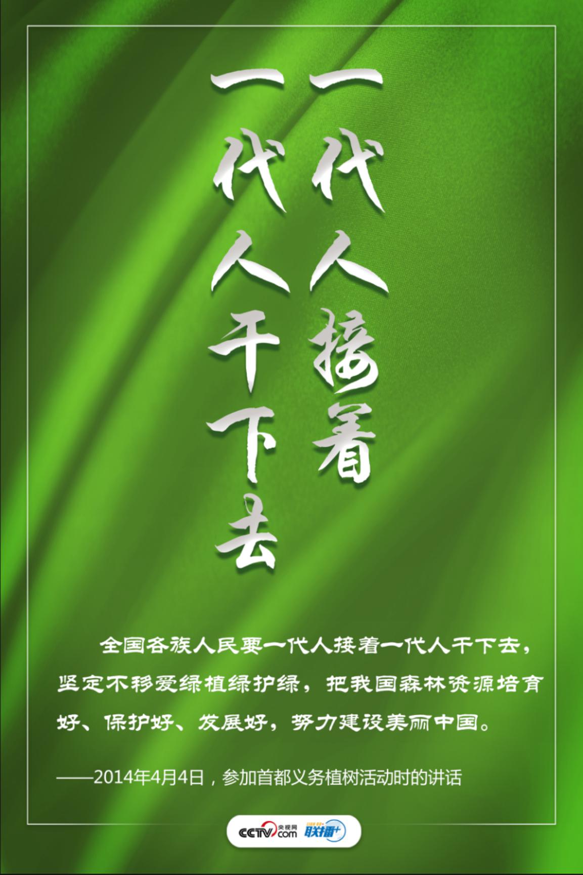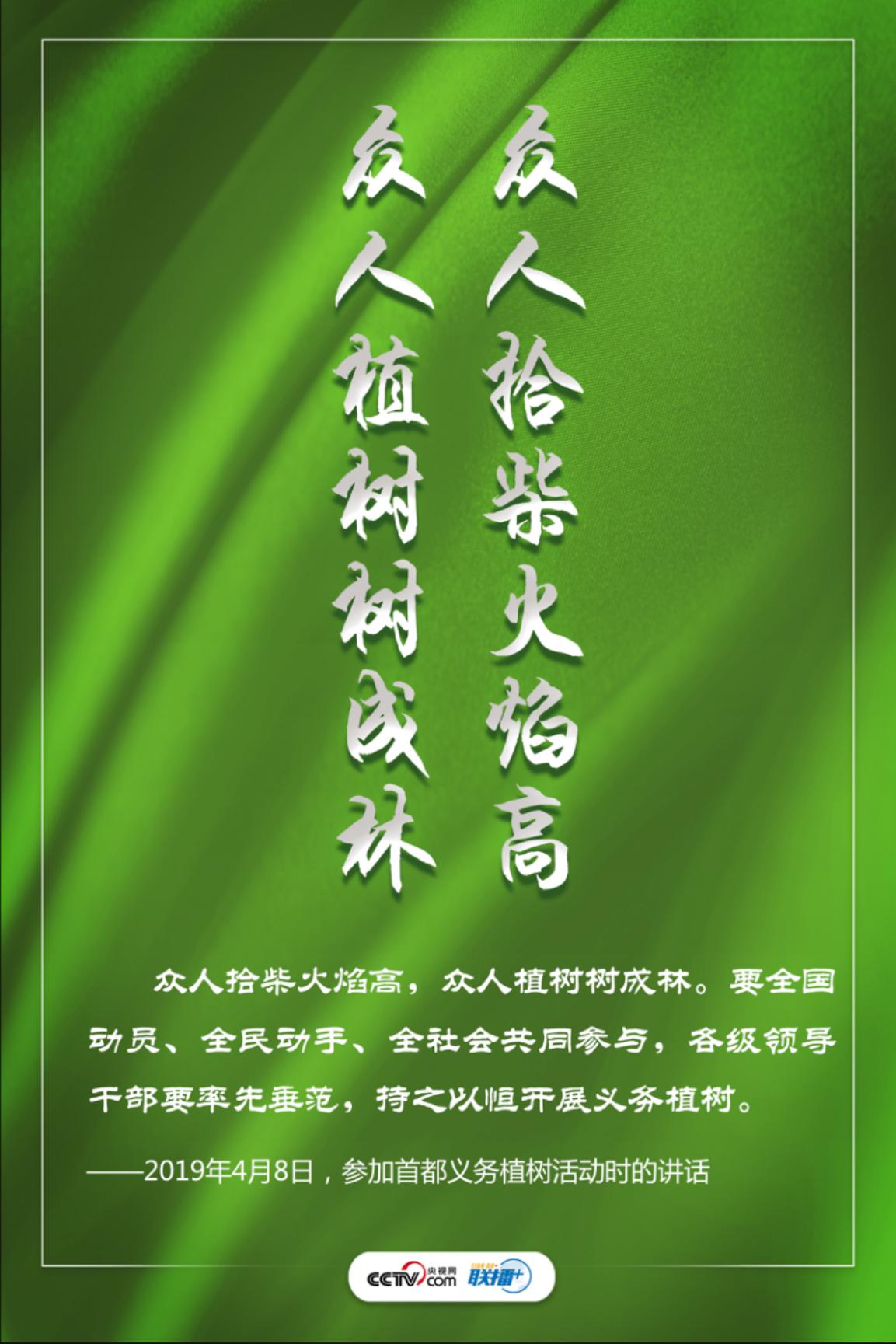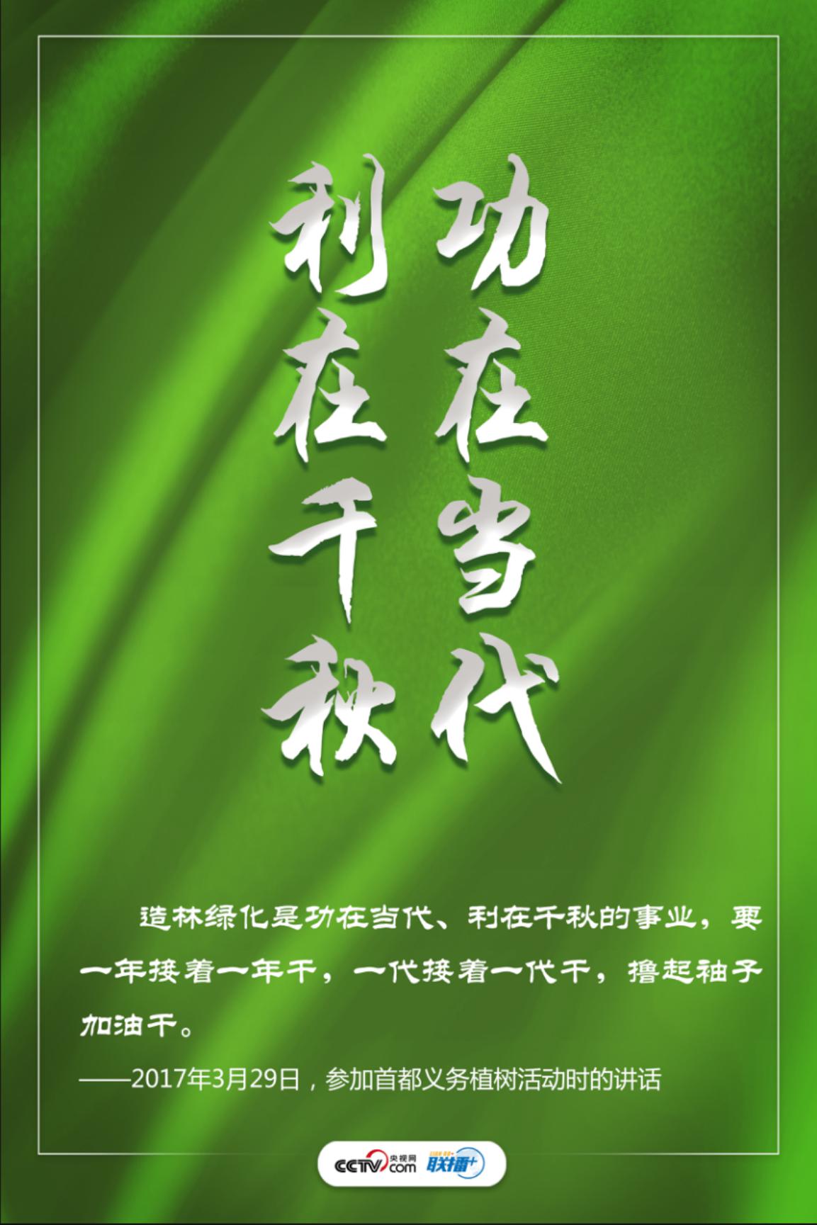 习近平叮嘱广大干部群众:“植树造林、保护森林,是每一位适龄公民应尽的法定义务。要坚持各级领导干部带头、全社会人人动手,鼓励和引导大家从自己做起、从现在做起,一起来为祖国大地绿起来、美起来尽一份力量。”