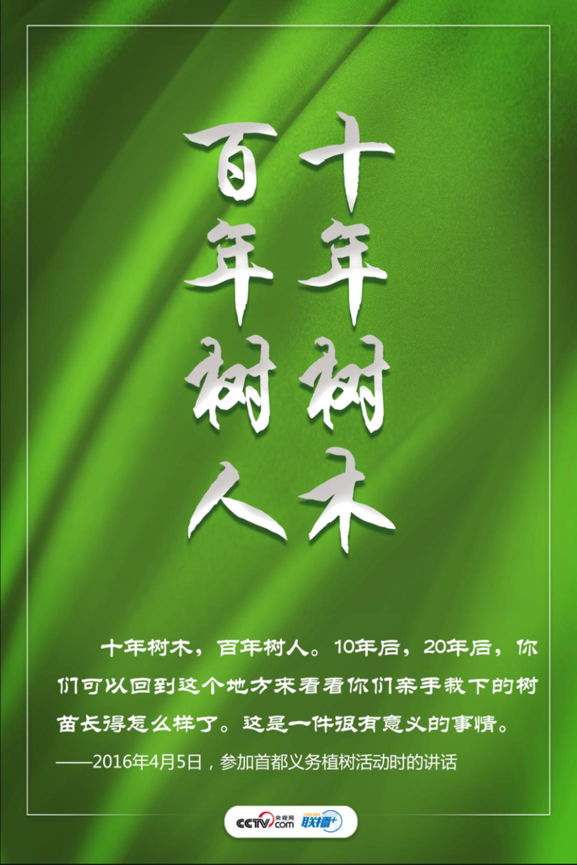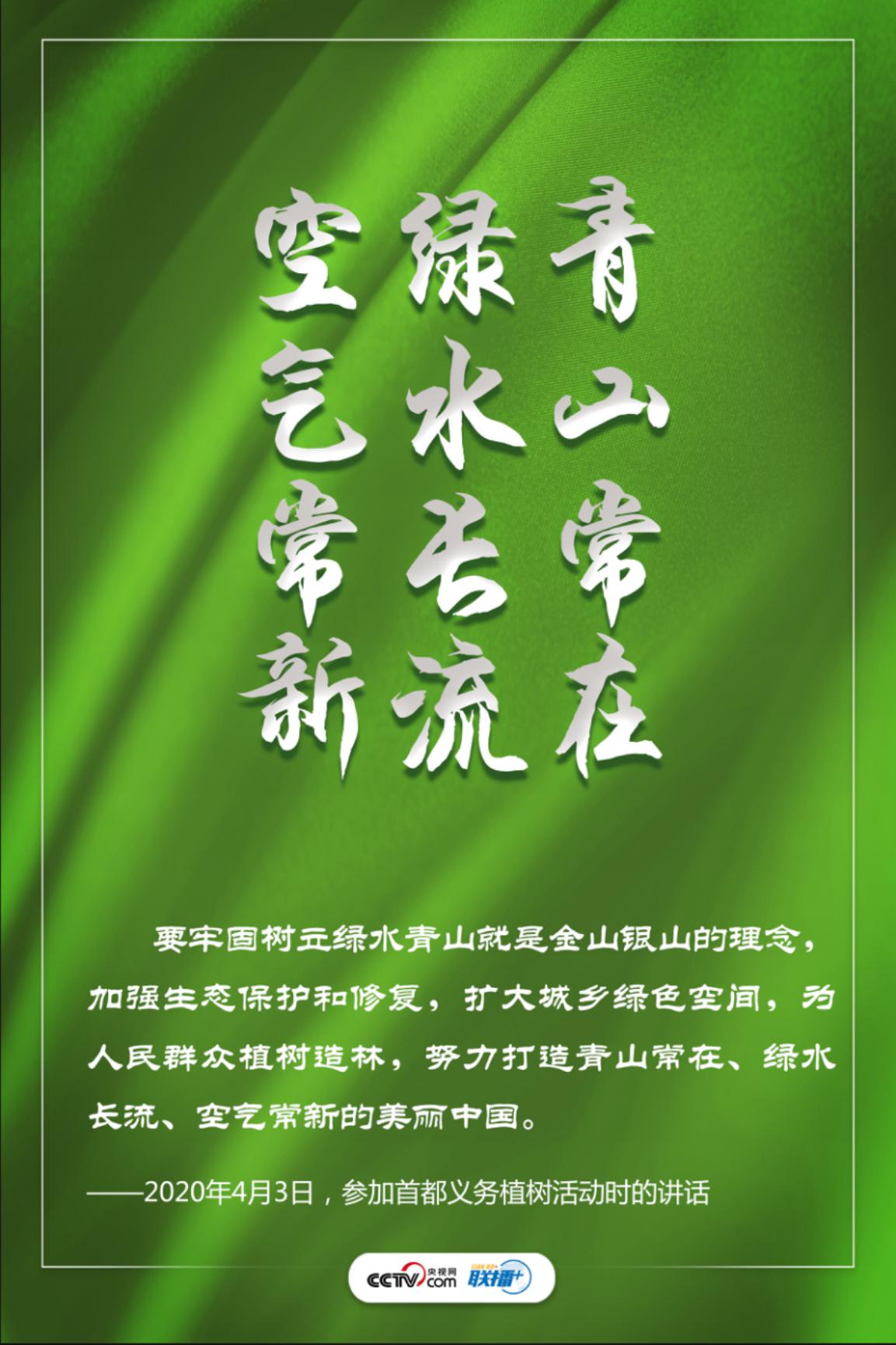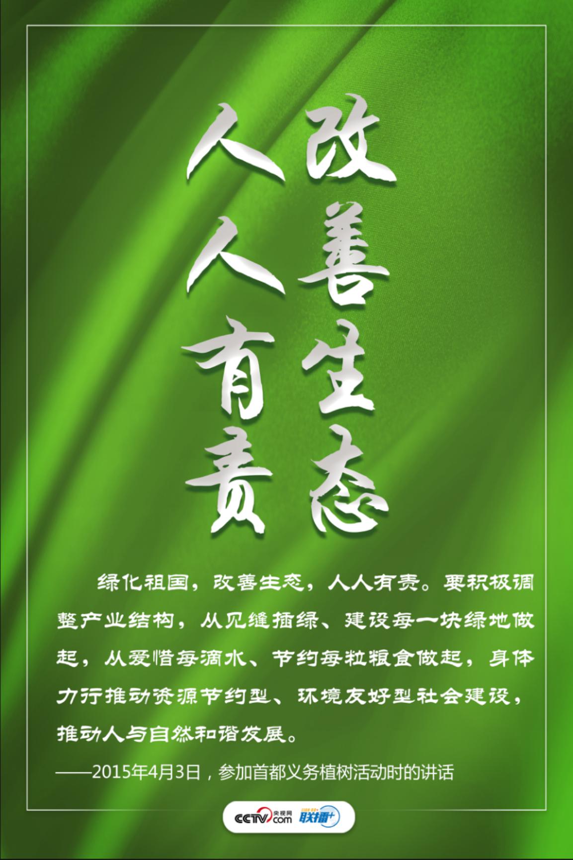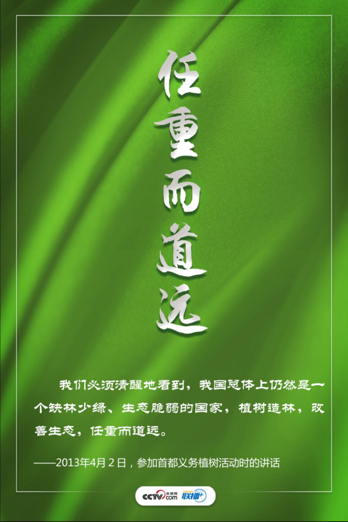 习近平叮嘱广大干部群众:“植树造林、保护森林,是每一位适龄公民应尽的法定义务。要坚持各级领导干部带头、全社会人人动手,鼓励和引导大家从自己做起、从现在做起,一起来为祖国大地绿起来、美起来尽一份力量。”